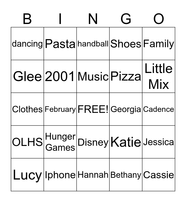 This bingo card has a free space and 31 words: Hannah, thirteen, February, One direction, dancing, handball, 2001, Katie, Georgia, Bethany, Cadence, Cassie, Josh Hutcherson, Harry Styles, Little Mix, Ciara, Jessica, Hunger Games, OLHS, Disney, Family, Friends, Lucy, Pasta, Pizza, Glee, Shoes, Clothes, Iphone, Music and Love.