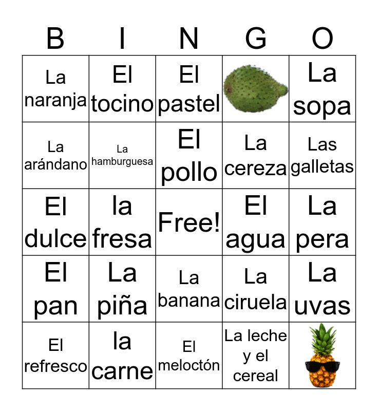 This bingo card has 4 images, a free space and 30 words: Las papas fritas, La leche y el cereal, Los huevos, El pescado, El pan, La hamburguesa, La sopa, El refresco, El tocino, El ensalada, El pollo, El pastel, Los frijoles, El arroz, El agua, Las galletas, la carne, El dulce, La piña, La ciruela, La banana, La manzana, La naranja, La pera, El meloctón, La guanábana, La cereza, La arándano, la fresa and La uvas.
