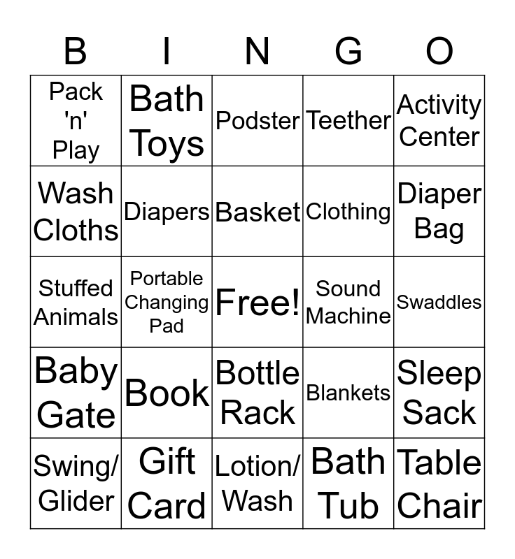 This bingo card has a free space and 24 words: Book, Gift Card, Basket, Swing/ Glider, Activity Center, Pack 'n' Play, Wash Cloths, Bath Toys, Sound Machine, Bottle Rack, Clothing, Stuffed Animals, Blankets, Sleep Sack, Diapers, Bath Tub, Swaddles, Podster, Diaper Bag, Portable Changing Pad, Table Chair, Baby Gate, Teether and Lotion/ Wash.
