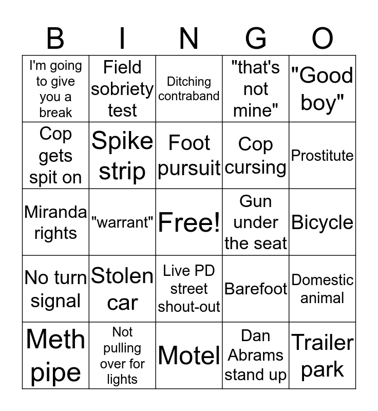 This bingo card has a free space and 32 words: Dan Abrams stand up, Cop suplex, "warrant", No headlights, No turn signal, Spike strip, "Good boy", Domestic animal, Field sobriety test, Vehicle pursuit, Foot pursuit, Ditching contraband, Night vision, Stolen gun, Gun under the seat, Drugs in cavity, Meth pipe, Miranda rights, Live PD street shout-out, Stolen car, Barefoot, Scales, Bicycle, Not pulling over for lights, Trailer park, "that's not mine", Cop cursing, Cop gets spit on, I'm going to give you a break, Motel, Suspended license and Prostitute.