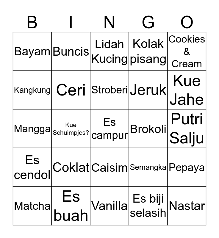 This bingo card has 25 words: Coklat, Vanilla, Stroberi, Matcha, Cookies & Cream, Bayam, Kangkung, Buncis, Brokoli, Caisim, Jeruk, Mangga, Semangka, Pepaya, Ceri, Nastar, Putri Salju, Lidah Kucing, Kue Jahe, Kue Schuimpjes?, Es campur, Es buah, Es cendol, Kolak pisang and Es biji selasih.