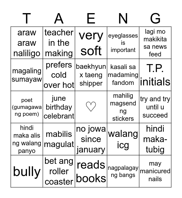 This bingo card has a free space and 24 words: mabilis magulat, bet ang roller coaster, baekhyun x taeng shipper, bully, lagi mo makikita sa news feed, araw araw naliligo, magaling sumayaw, teacher in the making, mahilig magsend ng stickers, no jowa since january, kasali sa madaming fandom, poet (gumagawa ng poem), walang icg, hindi maka-tubig, prefers cold over hot, nagpalagay ng bangs, try and try until u succeed, very soft, T.P. initials, june birthday celebrant, may manicured nails, hindi maka alis ng walang panyo, eyeglasses is important and reads books.