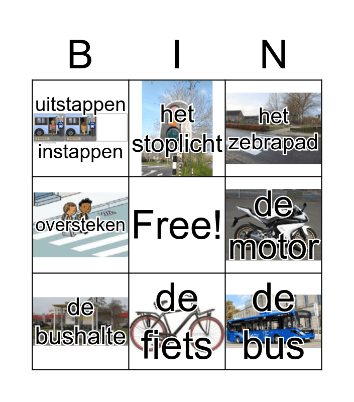 This bingo card has 11 images, a free space and 10 words: de auto, de fiets, de bus, de bushalte, het stoplicht, het zebrapad, de motor, de scooter, oversteken and uitstappen instappen.