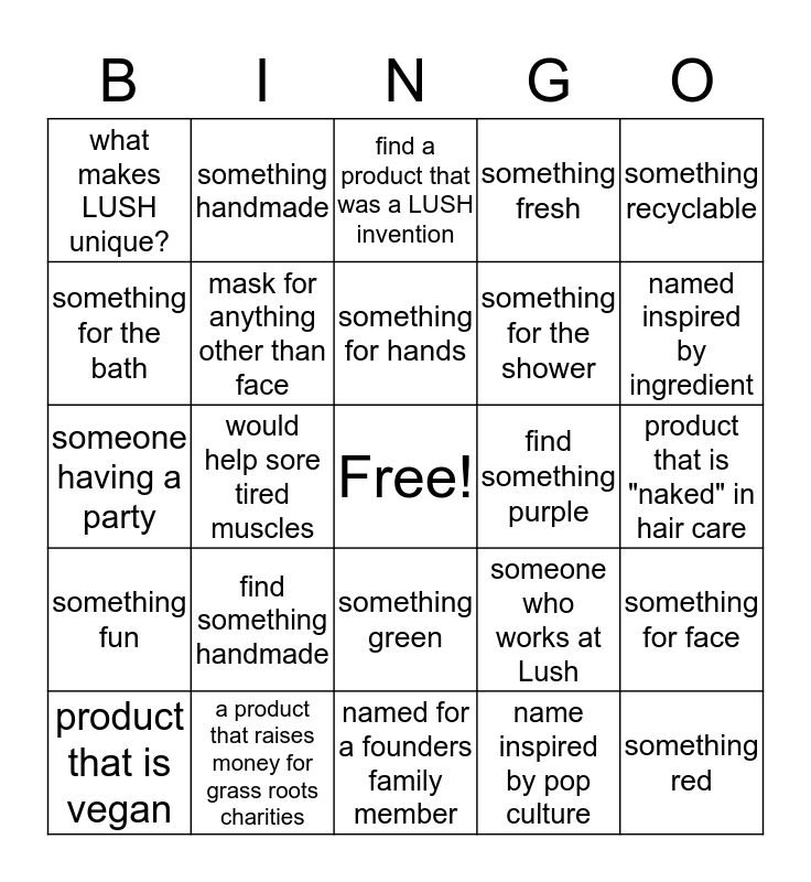 This bingo card has a free space and 29 words: product that is vegan, "naked" (zero waste) in skincare, would help sore tired muscles, product that has a food ingredient, what makes LUSH unique?, find a product that was a LUSH invention, mask for anything other than face, find something handmade, find something purple, a product that raises money for grass roots charities, product that is "naked" in hair care, something red, named for a founders family member, name inspired by pop culture, named inspired by ingredient, something yellow, something green, something fun, something recyclable, someone having a party, someone who works at Lush, someone who has a pet, something for the shower, something for the bath, something fresh, something handmade, something for face, something for hands and something for feet.
