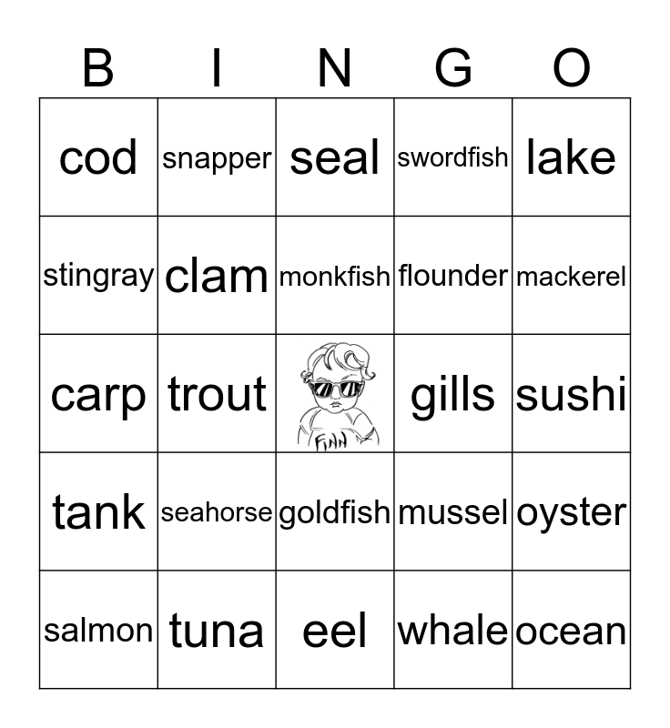 This bingo card has a free space and 29 words: salmon, shrimp, trout, shark, cod, seal, clam, seahorse, gills, tuna, sushi, ocean, eel, whale, mackerel, seaweed, goldfish, tank, lake, carp, mussel, waves, flounder, stingray, swordfish, snapper, oyster, monkfish and sardine.