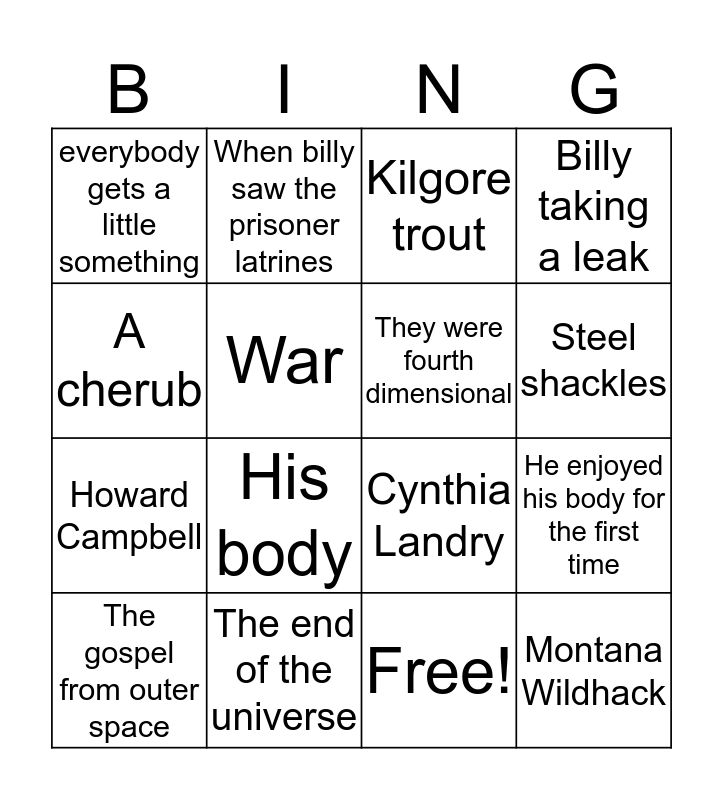 This bingo card has 17 words: Free!, The gospel from outer space, Kilgore trout, everybody gets a little something, His body, Billy taking a leak, He enjoyed his body for the first time, They were fourth dimensional, Steel shackles, War, The end of the universe, Cynthia Landry, A cherub, When billy saw the prisoner latrines, Howard Campbell, If you’re so smart, why ain’t you rich and Montana Wildhack.