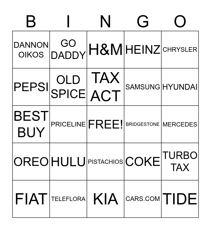 This bingo card has a free space and 24 words: HULU, TELEFLORA, TAX ACT, FIAT, CHRYSLER, DANNON OIKOS, PEPSI, GO DADDY, BRIDGESTONE, PISTACHIOS, SAMSUNG, BEST BUY, COKE, TURBO TAX, OLD SPICE, CARS.COM, MERCEDES, H&M, HYUNDAI, PRICELINE, TIDE, OREO, HEINZ and KIA.