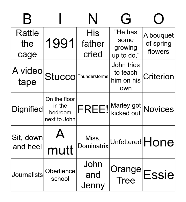 This bingo card has a free space and 24 words: A mutt, Obedience school, Thunderstorms, Journalists, A bouquet of spring flowers, Rattle the cage, A video tape, 1991, Marley got kicked out, Miss. Dominatrix, John tries to teach him on his own, Dignified, Unfettered, Hone, Stucco, Orange Tree, Novices, His father cried, Criterion, On the floor in the bedroom next to John, Essie, Sit, down and heel, "He has some growing up to do." and John and Jenny.