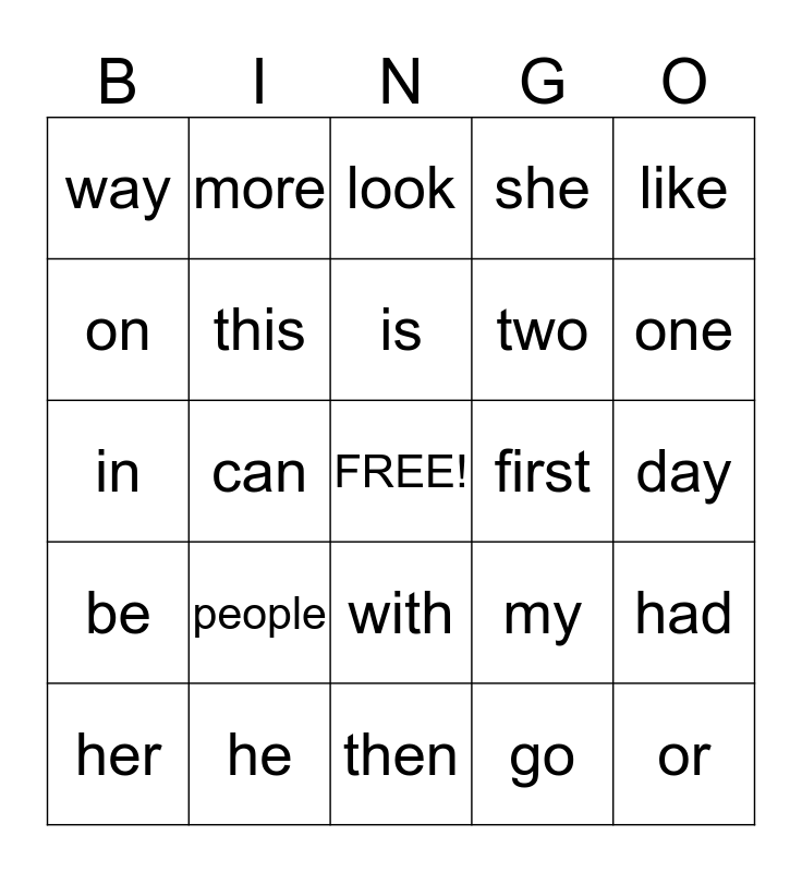 This bingo card has a free space and 24 words: people, he, is, her, like, way, on, more, first, with, two, in, my, had, this, go, day, look, one, can, or, be, she and then.