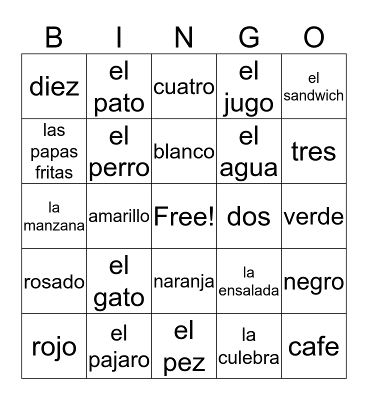 This bingo card has a free space and 29 words: rojo, azul, amarillo, uno, diez, cuatro, el perro, el gato, dos, el pajaro, verde, cafe, el pez, la culebra, tres, cinco, naranja, rosado, el sandwich, la manzana, la ensalada, el pan, el agua, las papas fritas, el jugo, el pato, negro, blanco and ocho.