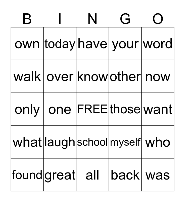 This bingo card has a free space and 24 words: laugh, great, know, found, word, own, walk, today, those, school, other, only, myself, who, over, back, want, have, now, one, was, what, your and all.