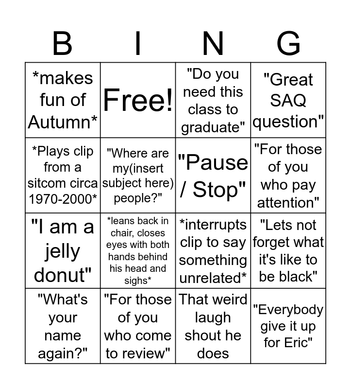 This bingo card has 32 words: "Now there is nothing funny about this", "Again, How divided we are", "Lets not forget what it's like to be black", "Another regnerism", "Everybody give it up for Eric", "Pause / Stop", *Plays clip from a sitcom circa 1970-2000*, " Remember this", Free!, "I hope i don't waste your time with this", "For those of you who pay attention", "Do you need this class to graduate", *reminds class of his childhood hardships*, "Ronald Reagan", "For those of you who come to review", "where I am going to take you today", "Do me a favor, don't speak for the rest of the class", *interrupts clip to say something unrelated*, "I hope I don't waste your time", "Great quote", "What class is this?", "The benefit of reading the news", That weird laugh shout he does, *gets a name wrong*, "What's your name again?", "Great SAQ question", "I am a jelly donut", "Where are my(insert subject here) people?", *makes fun of Autumn*, *says something relating to farm life to nate*, "I am getting too old?" and *leans back in chair, closes eyes with both hands behind his head and sighs*.