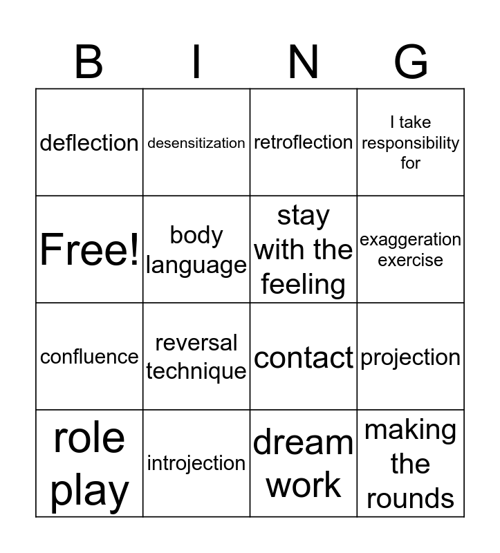 This bingo card has 16 words: introjection, projection, retroflection, deflection, confluence, desensitization, contact, dream work, Free!, body language, role play, I take responsibility for, reversal technique, exaggeration exercise, stay with the feeling and making the rounds.