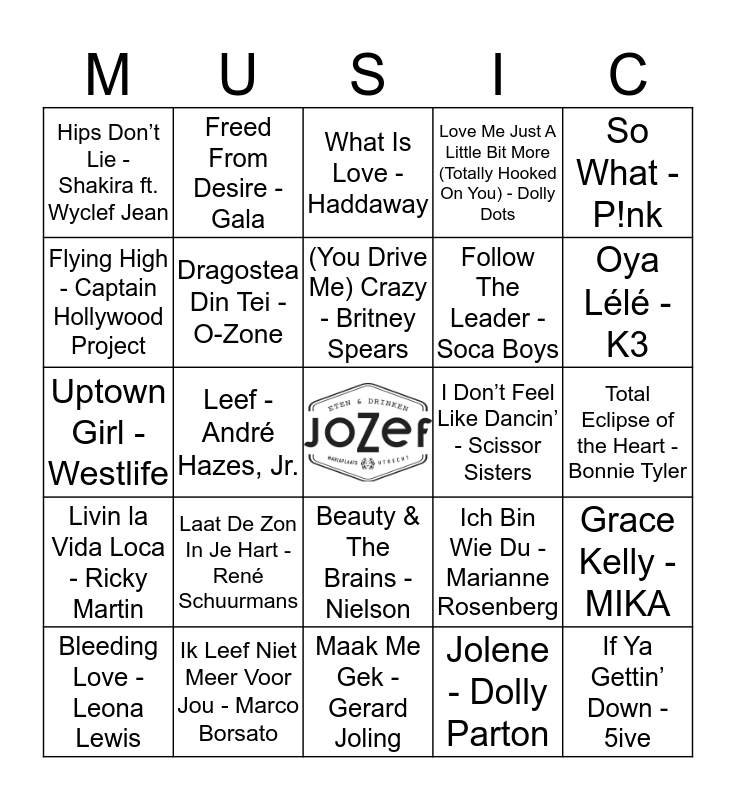 This bingo card has a free space and 24 words: Laat De Zon In Je Hart - René Schuurmans, Ik Leef Niet Meer Voor Jou - Marco Borsato, (You Drive Me) Crazy - Britney Spears, Bleeding Love - Leona Lewis, So What - P!nk, Hips Don’t Lie - Shakira ft. Wyclef Jean, Flying High - Captain Hollywood Project, Freed From Desire - Gala, I Don’t Feel Like Dancin’ - Scissor Sisters, Beauty & The Brains - Nielson, Follow The Leader - Soca Boys, Uptown Girl - Westlife, Ich Bin Wie Du - Marianne Rosenberg, Grace Kelly - MIKA, Dragostea Din Tei - O-Zone, Jolene - Dolly Parton, Total Eclipse of the Heart - Bonnie Tyler, What Is Love - Haddaway, Oya Lélé - K3, Leef - André Hazes, Jr., If Ya Gettin’ Down - 5ive, Livin la Vida Loca - Ricky Martin, Love Me Just A Little Bit More (Totally Hooked On You) - Dolly Dots and Maak Me Gek - Gerard Joling.
