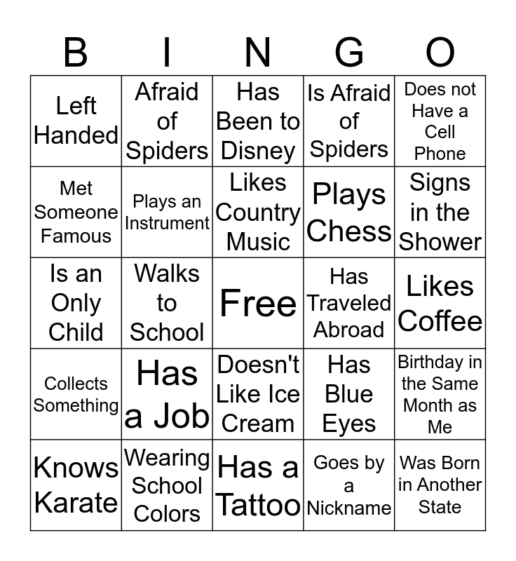 This bingo card has a free space and 24 words: Has a Job, Wearing School Colors, Likes Country Music, Knows Karate, Does not Have a Cell Phone, Left Handed, Met Someone Famous, Afraid of Spiders, Has Traveled Abroad, Doesn't Like Ice Cream, Plays Chess, Is an Only Child, Has Blue Eyes, Birthday in the Same Month as Me, Plays an Instrument, Goes by a Nickname, Likes Coffee, Has Been to Disney, Signs in the Shower, Walks to School, Was Born in Another State, Collects Something, Is Afraid of Spiders and Has a Tattoo.