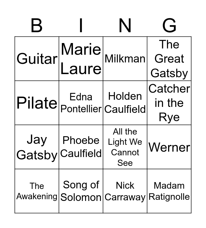This bingo card has 17 words: Nick Carraway, The Awakening, Milkman, Guitar, Phoebe Caulfield, The Great Gatsby, Werner, Holden Caulfield, Catcher in the Rye, Edna Pontellier, Song of Solomon, All the Light We Cannot See, Pilate, Marie Laure, Jay Gatsby, Daisy Buchanan and Madam Ratignolle.