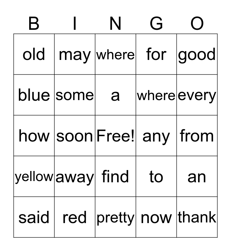 This bingo card has a free space and 29 words: said, round, soon, there, old, where, some, away, any, red, from, thank, pretty, now, every, them, find, yellow, good, how, to, please, where, blue, for, may, an, a and find.