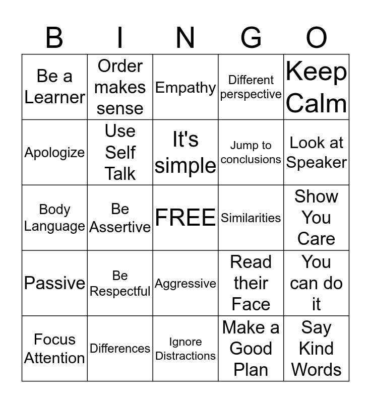 This bingo card has a free space and 29 words: Focus Attention, Listen, Be Assertive, Conflicting Feelings, Be a Learner, Empathy, Use Self Talk, Be Respectful, Similarities, Differences, Show You Care, Say Kind Words, Ignore Distractions, Make a Good Plan, Look at Speaker, Think about their Words, Aggressive, Passive, Keep Calm, Body Language, Read their Face, Look at the Situation, Jump to conclusions, Apologize, Different perspective, Order makes sense, You can do it, It's simple and Make a choice.