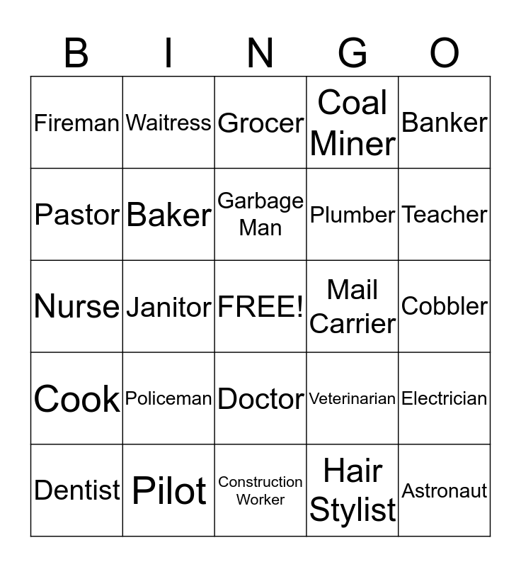 This bingo card has a free space and 24 words: Policeman, Pilot, Garbage Man, Dentist, Banker, Fireman, Pastor, Waitress, Mail Carrier, Doctor, Plumber, Nurse, Veterinarian, Electrician, Baker, Hair Stylist, Cobbler, Grocer, Teacher, Janitor, Astronaut, Cook, Coal Miner and Construction Worker.