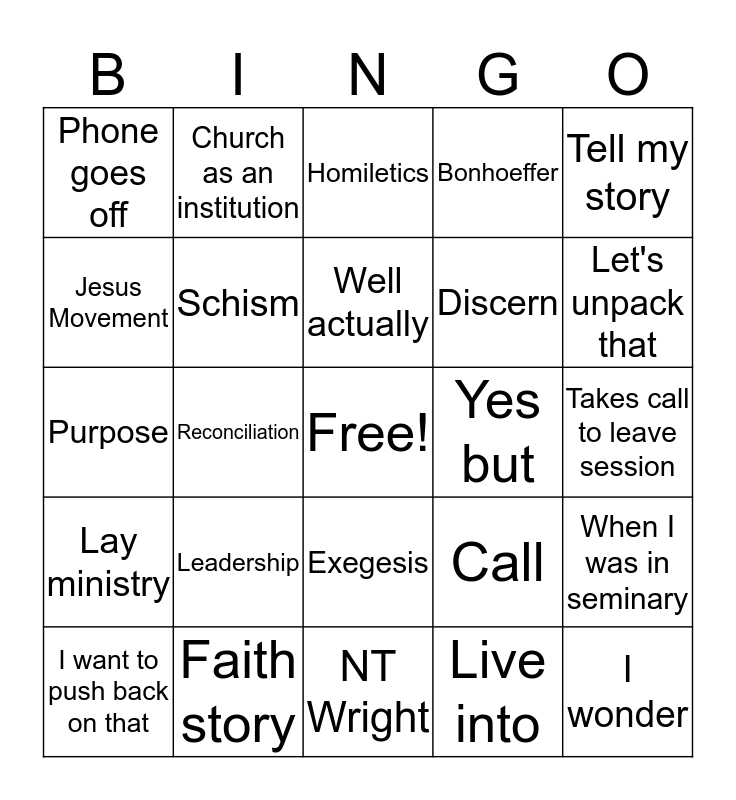 This bingo card has a free space and 33 words: Skip cries, 3 legged stool, Reconciliation, Outreach, Lay ministry, Schism, Tell my story, I want to push back on that, Church as an institution, Safe space, Well actually, Homiletics, Baptismal Covenant, And again, Yes but, Let's unpack that, Faith story, Purpose, Leadership, Call, Exegesis, Family Systems, Phone goes off, Takes call to leave session, NT Wright, I wonder, Bonhoeffer, Discern, Jesus Movement, When I was in seminary, Priest talks for the 3rd time, Live into and Both/and.