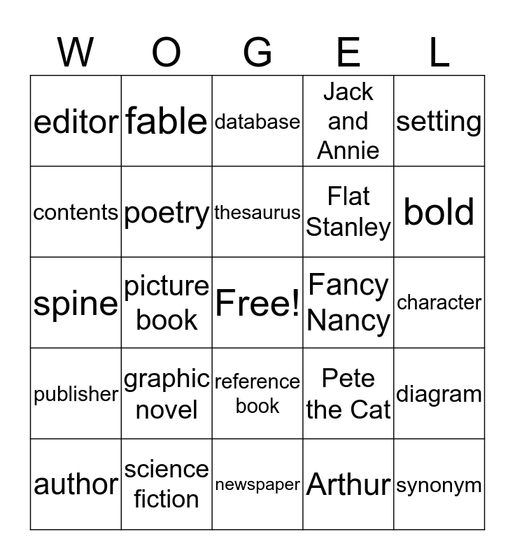 This bingo card has a free space and 58 words: title, fantasy, dictionary, Arthur, synonym, copyright, poetry, OPAC, Fancy Nancy, antonym, contents, historical fiction, Curious George, guide words, dedication, fable, thesaurus, Jack and Annie, caption, spine, picture book, database, Clifford, character, book jacket, graphic novel, print encyclopedia, Geronimo Stilton, setting, author, biography, atlas, Piggie and Gerald, keyword, publisher, autobiography, online encyclopedia, Pete the Cat, bold, index, science fiction, newspaper, Freddie Fernortner, alphabetize, glossary, realistic fiction, magazine, Stink, diagram, cover, fairy tale, reference book, Ricky Ricotta, renew, editor, nonfiction, Flat Stanley and hold.