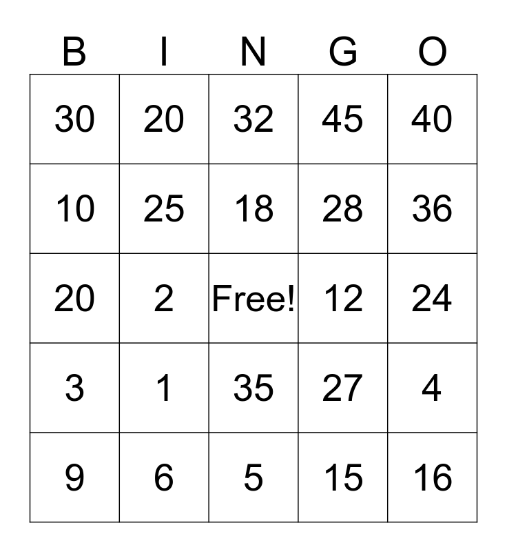 This bingo card has a free space and 24 words: 1, 6, 18, 9, 40, 30, 10, 20, 12, 35, 28, 20, 27, 4, 25, 15, 24, 32, 36, 2, 16, 3, 45 and 5.