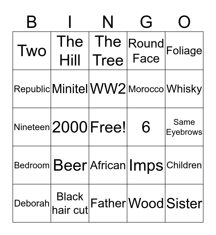This bingo card has a free space and 44 words: Ana, Sister, Mother, Deborah, Eyes, Wood, The Tree, 7, Foliage, Black hair cut, Round Face, 6, African, Beer, Twins, Father, Janus, Nineteen, Inside, Whisky, The Hill, Grass-hopper, Partner, Two, Nose, Same Eyebrows, Teddy Bear, Mouth, Imps, Bedroom, Chlorophyll, Children, Oyster, 1976, 2000, 79, Roman Catholic, French, WW2, Republic, Morocco, Tunisia, Minitel and Paper Fish.