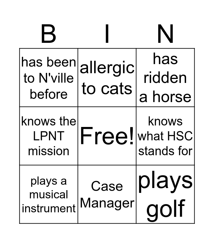 This bingo card has a free space and 24 words: works in Med/Surg, Physician, Case Manager, B'day in month of May, plays golf, has been to N'ville before, knows what HSC stands for, allergic to cats, can whistle loudly, likes to dance, loves to travel, loves to hike/walk, performs karaoke, gets up before 6AM, plays a musical instrument, can juggle, was not born in TN, has ridden a horse, has been to Europe, loves the beach, drinks wine, doesn't know how to swim, knows the LPNT mission and knows the LPNT vision.