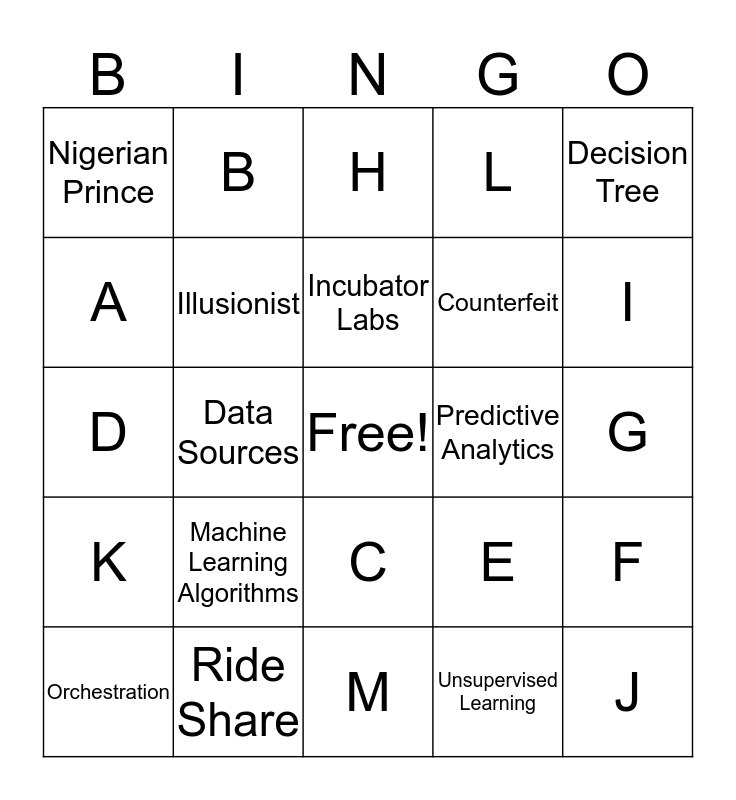 This bingo card has a free space and 24 words: Machine Learning Algorithms, Ride Share, Incubator Labs, Orchestration, Decision Tree, Nigerian Prince, A, B, Predictive Analytics, C, Counterfeit, D, E, F, Illusionist, Unsupervised Learning, G, H, I, Data Sources, J, K, L and M.