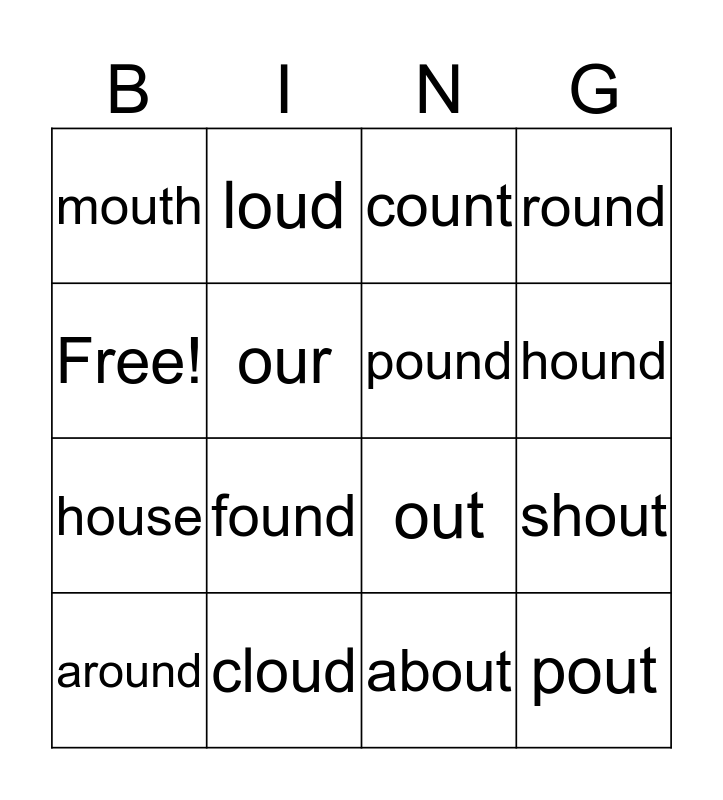 This bingo card has 16 words: cloud, shout, count, mouth, house, loud, out, about, Free!, our, around, round, found, hound, pound and pout.