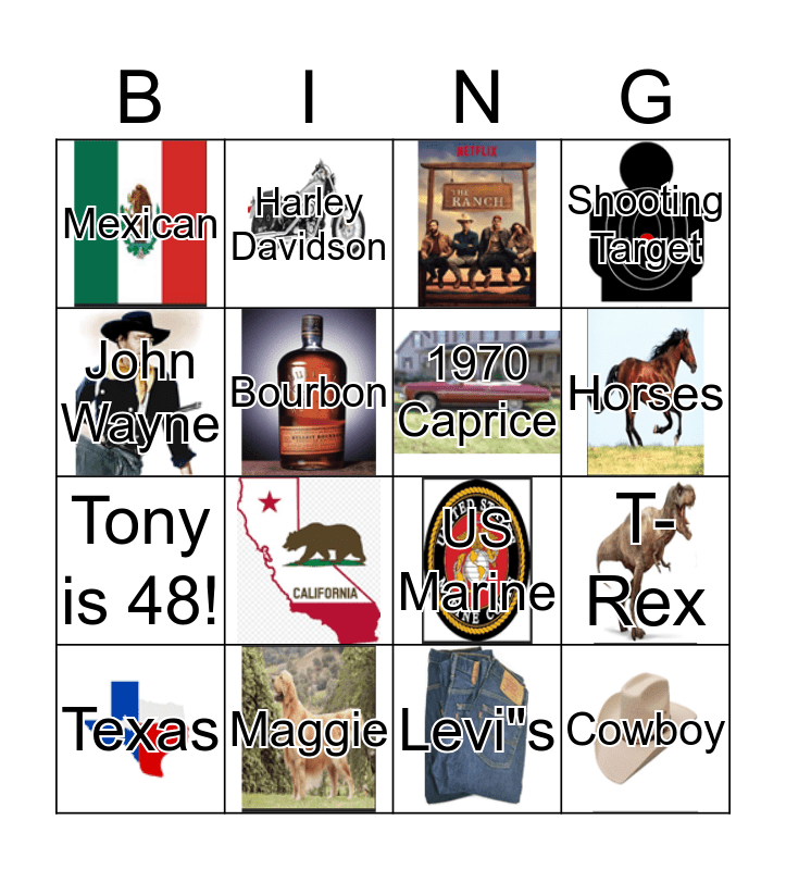 This bingo card has 19 images and 17 words: T-Rex, Handcuffs, Sam Elliott, Texas, John Wayne, Maggie, Mexican, Tony is 48!, Harley Davidson, US Marine, Bourbon, Cowboy, 1970 Caprice, Harley Davidson, Horses, Shooting Target and Levi"s.