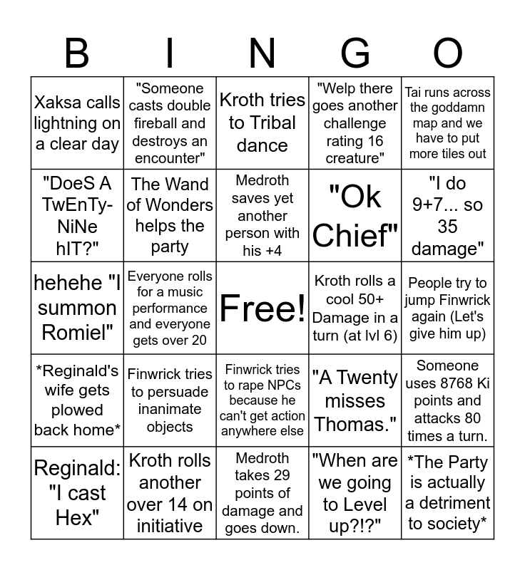 This bingo card has a free space and 24 words: Finwrick tries to persuade inanimate objects, Kroth rolls another over 14 on initiative, Medroth saves yet another person with his +4, Reginald: "I cast Hex", Tai runs across the goddamn map and we have to put more tiles out, Xaksa calls lightning on a clear day, "DoeS A TwEnTy-NiNe hIT?", "Someone casts double fireball and destroys an encounter", Kroth rolls a cool 50+ Damage in a turn (at lvl 6), Finwrick tries to rape NPCs because he can't get action anywhere else, "Ok Chief", hehehe "I summon Romiel", "A Twenty misses Thomas.", Someone uses 8768 Ki points and attacks 80 times a turn., The Wand of Wonders helps the party, "When are we going to Level up?!?", People try to jump Finwrick again (Let's give him up), Kroth tries to Tribal dance, "I do 9+7... so 35 damage", Everyone rolls for a music performance and everyone gets over 20, *The Party is actually a detriment to society*, *Reginald's wife gets plowed back home*, "Welp there goes another challenge rating 16 creature" and Medroth takes 29 points of damage and goes down..