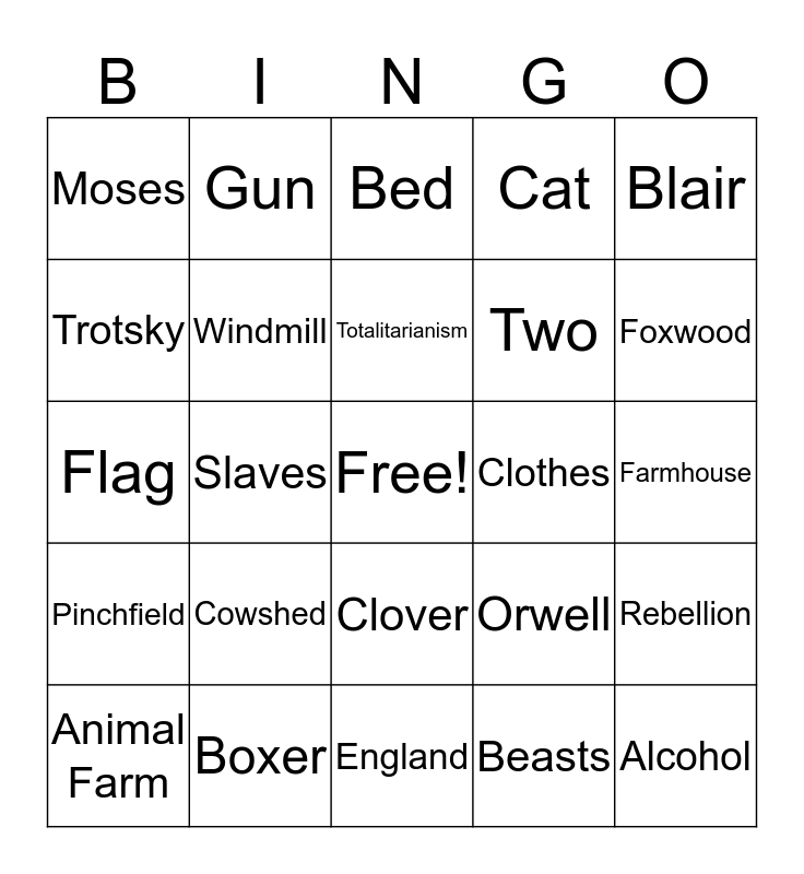 This bingo card has a free space and 44 words: 1945, Alcohol, Allegory, Animal Farm, Animalism, Beasts, Bed, Benjamin, Blair, Boxer, Cat, Clothes, Clover, Cowshed, Dogs, England, Equal, Flag, Four, Foxwood, Gun, Manor Farm, Mollie, Moses, Mr. Jones, Farmhouse, Napoleon, Old Major, Orwell, Pinchfield, Puppies, Rebellion, Seven, Sheep, Slaves, Snowball, Squealer, Stalin, Totalitarianism, Trotsky, Two, Whip, Windmill and work.
