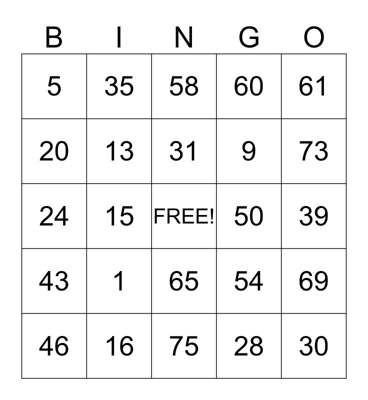 This bingo card has a free space and 24 words: 1, 16, 31, 46, 61, 5, 20, 35, 50, 65, 9, 24, 54, 69, 13, 28, 39, 58, 73, 15, 30, 43, 60 and 75.