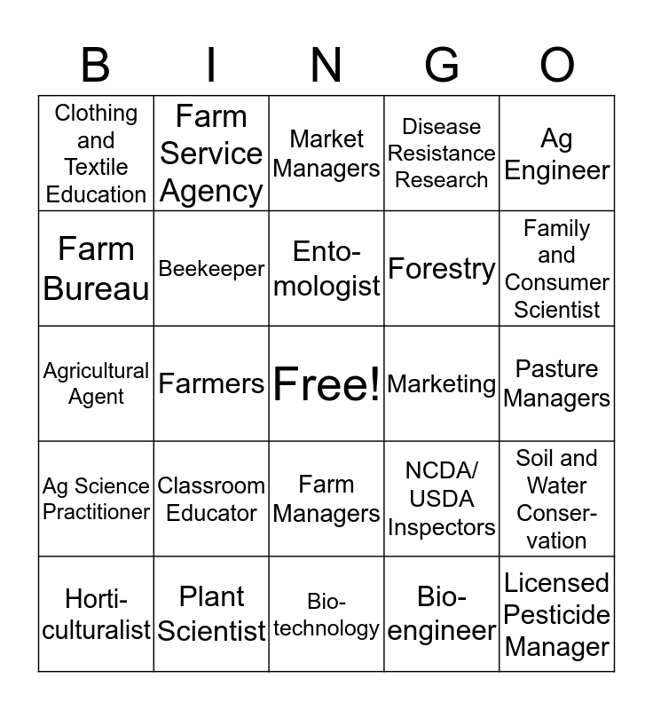 This bingo card has a free space and 24 words: Classroom Educator, Plant Scientist, Ento-mologist, Horti-culturalist, Ag Engineer, Clothing and Textile Education, Farm Bureau, Farm Service Agency, Marketing, Farm Managers, Forestry, Agricultural Agent, NCDA/ USDA Inspectors, Soil and Water Conser-vation, Beekeeper, Bio-engineer, Pasture Managers, Market Managers, Family and Consumer Scientist, Farmers, Licensed Pesticide Manager, Ag Science Practitioner, Disease Resistance Research and Bio-technology.