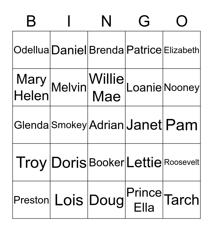 This bingo card has a free space and 24 words: Preston, Doris, Willie Mae, Prince Ella, Elizabeth, Odellua, Daniel, Brenda, Janet, Pam, Glenda, Melvin, Lettie, Roosevelt, Mary Helen, Lois, Doug, Patrice, Nooney, Troy, Smokey, Booker, Loanie and Tarch.