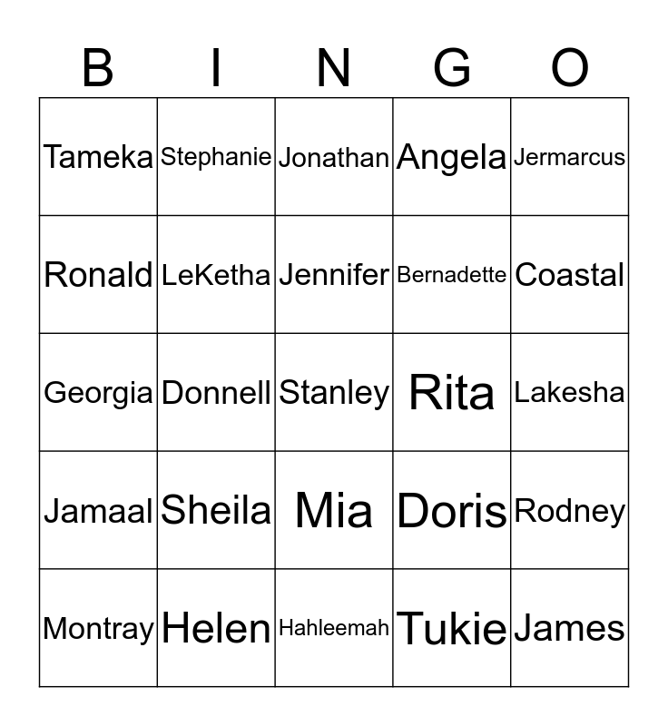 This bingo card has a free space and 25 words: Sheila, Hahleemah, Jennifer, Montray, Jermarcus, Tameka, Ronald, Stephanie, Rita, Mia, Bernadette, Georgia, Doris, Rodney, LeKetha, Maia, Lakesha, Jonathan, Coastal, Donnell, James, Helen, Jamaal, Angela and Tukie.