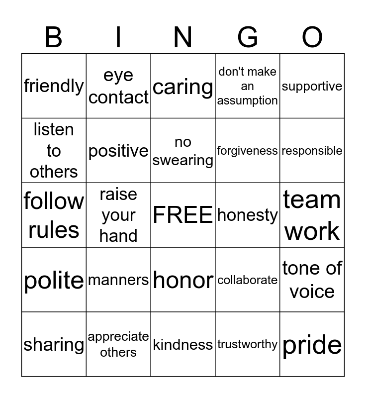 This bingo card has a free space and 29 words: sharing, taking turns, raise your hand, good choices, friendly, caring, positive, manners, honesty, appreciate others, team work, pride, kindness, trustworthy, responsible, self-control, honor, polite, supportive, follow rules, collaborate, try your best, forgiveness, listen to others, don't make an assumption, eye contact, tone of voice, no swearing and open-minded.
