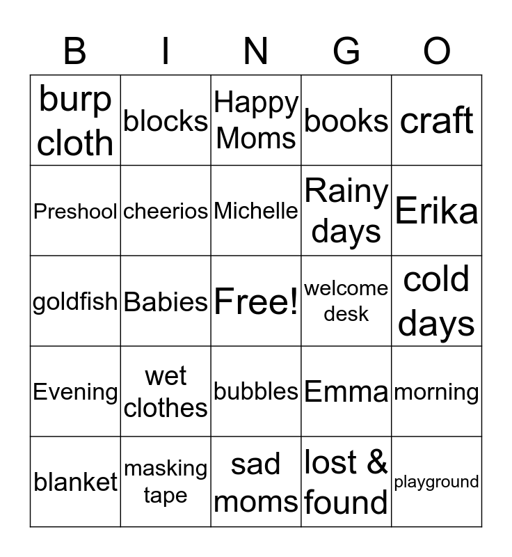 This bingo card has a free space and 77 words: stroller, No bottle warming, Happy Moms, Crying Kids, Kids Care t-shirts, trucks, slide, playdoh, crayons, Ouch Reports, Ice packs, Rule of 2, Michelle, Preshool, toddlers, Babies, Crawlers, playground, Lesson, craft, Bible, goldfish, cheerios, blocks, books, toys, dolls, diapers, wipes, Dawn, Jane, Virginia, Dothline, Emma, Erika, Rainy days, Sunny days, warm days, cold days, lost & found, jackets, missing lunch, sippy cups, water bottle, bottles, pacifier, blanket, burp cloth, Trish, snack time, lunch time, bubbles, Bible story, Baby church, music time, singing, name tags, pick up tag, bag tag, accidents, wet clothes, Paycom, clock in, clock out, email, text message, phone call, welcome desk, Ft. Worth campus, West campus, South campus, morning, Evening, masking tape, Bible memory, sad moms and happy kids.