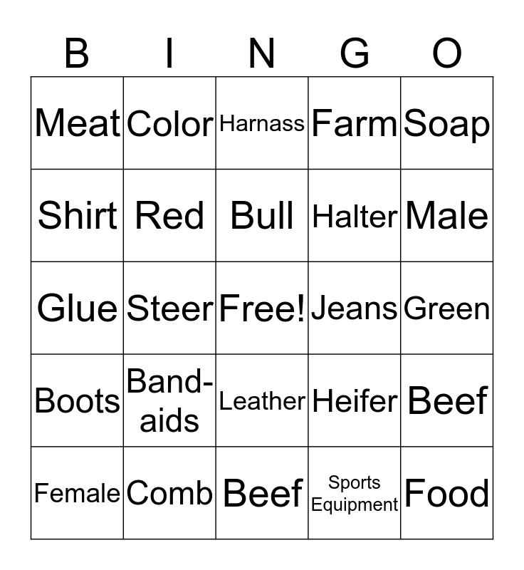 This bingo card has a free space and 24 words: Band-aids, Comb, Bull, Female, Soap, Meat, Shirt, Color, Jeans, Leather, Halter, Glue, Heifer, Beef, Red, Sports Equipment, Green, Harnass, Male, Steer, Food, Boots, Farm and Beef.