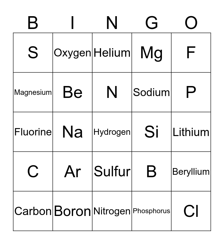 This bingo card has 36 words: H, He, Li, Be, B, C, N, O, F, Ne, Na, Mg, Al, Si, P, S, Cl, Ar, Hydrogen, Helium, Lithium, Beryllium, Boron, Carbon, Nitrogen, Oxygen, Fluorine, Neon, Sodium, Magnesium, Aluminum, Silicon, Phosphorus, Sulfur, Chlorine and Argon.
