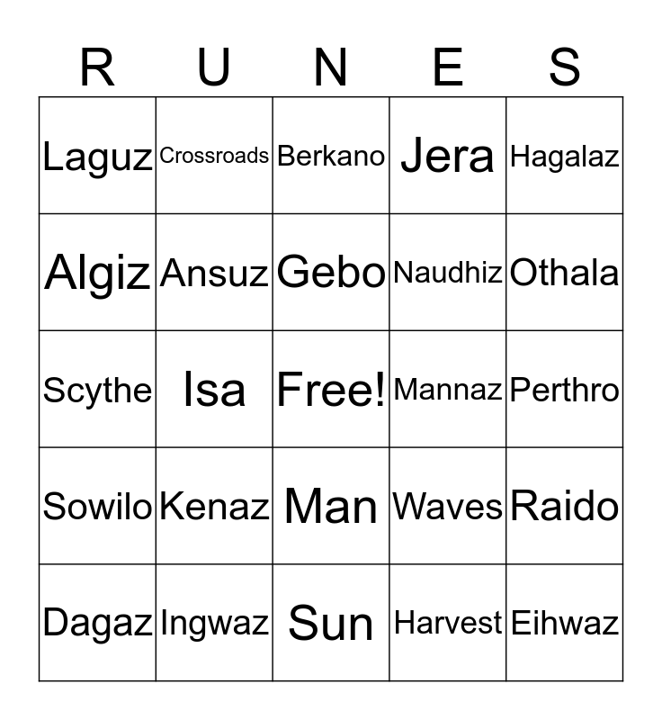 This bingo card has a free space and 38 words: Fehu, Uruz, Thurisaz, Ansuz, Raido, Kenaz, Gebo, Wunjo, Hagalaz, Naudhiz, Isa, Jera, Eihwaz, Perthro, Algiz, Sowilo, Teiwaz, Berkano, Ehwaz, Mannaz, Laguz, Ingwaz, Othala, Dagaz, Blank, Sun, Moon, Flight, Rings, Romance, Woman, Man, Harvest, Crossroads, Star, Waves, Scythe and Eye.