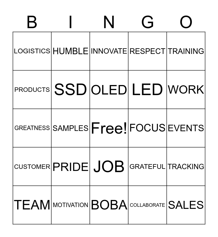 This bingo card has a free space and 44 words: TARGET, SALES, SPOT AWARD, TEAM, SUMMER, COLLABORATE, INNOVATE, GROW, TRAINING, MOTIVATION, RESPECT, FOCUS, JOB, PRIDE, FAIRNESS, BOBA, THANKFUL, GREATNESS, SHARKS, WORK, HUMBLE, RMA, CREDIT, LOGISTICS, LEADERSHIP, EVENTS, CONGRATULATIONS, SAMSUNG, GRATEFUL, CUSTOMER, ORDERS, TRACKING, HUB, DROPSHIP, SAMPLES, MEETINGS, MEMORY, DISPLAY, OLED, PRODUCTS, LED, DRAM, SSD and NAND.