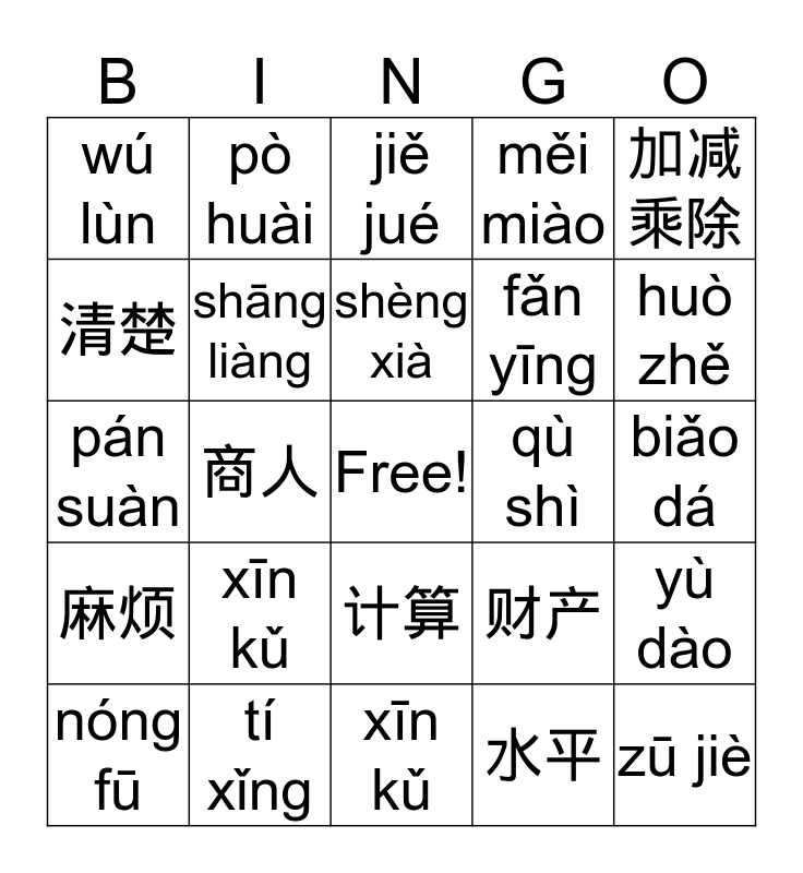 This bingo card has a free space and 25 words: xīn kǔ, xīn kǔ, shèng xià, nóng fū, 加减乘除, wú lùn, 清楚, pò huài, qù shì, 计算, fǎn yīng, pán suàn, 财产, yù dào, shāng liàng, 产生, biǎo dá, jiě jué, huò zhě, 商人, zū jiè, tí xǐng, 麻烦, měi miào and 水平.