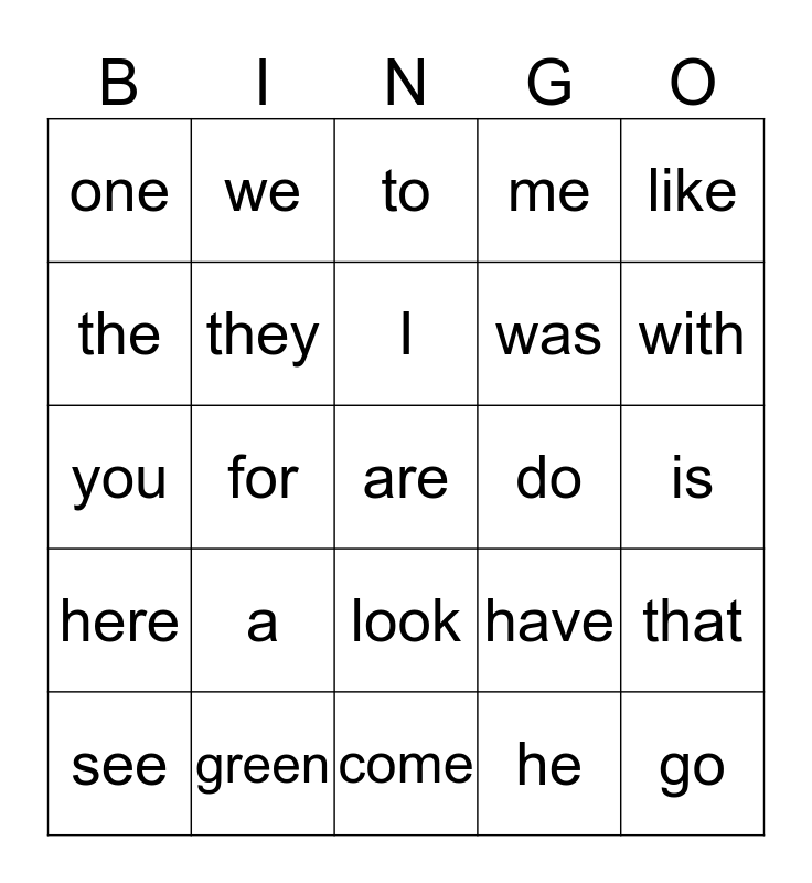 This bingo card has a free space and 24 words: a, green, I, see, like, one, the, we, do, look, was, you, have, that, they, he, is, to, with, for, go, here, me and come.