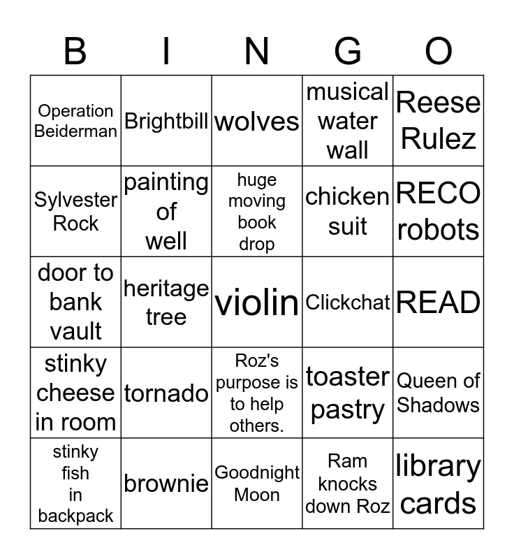 This bingo card has 65 words: cyber bullying, chess pawn, Red the oak tree, Queen of Shadows, kitten, Planet Amigo, Brightbill, Samar, huge moving book drop, Maeve, Roz's purpose is to help others., well dweller, READ, Reese Rulez, Bubbles the cat, Sylvester Rock, heritage tree, Operation Beiderman, selkie, chicken suit, tornado, stinky cheese in room, musical water wall, Go be wild., Alex's red hair/ braids, Fembots, Wonder Dome, Dr. Molovo, violin, Leave, stinky fish in backpack, friend, Acts of Kindness, Lego pirate ship, toaster pastry, brownie, read the dictionary, door to bank vault, Ram knocks down Roz, licorice, painting of well, bad poetry curse, Clickchat, rain, braid unicorn's mane, Stay, RECO robots, Bongo the crow, library cards, tree hollow, Pink Horror, Metaworld, Dandy Bandits, Goodnight Moon, lemon powered light, Princess of Sunshine, Roof of Epic Proportions, wolves, magic ring to detect the truth, mohawk, Troll doll, Black Spot, pigeons help Roz, wishtree and Roz wants to be her true self..