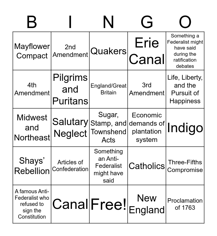 This bingo card has 31 words: Free!, God, Gold, Glory, Salutary Neglect, Virginia House of Burgesses, Mayflower Compact, Quakers, Pilgrims and Puritans, Catholics, Economic demands of plantation system, New England, Indigo, Sugar, Stamp, and Townshend Acts, Proclamation of 1763, Unalienable Rights, Life, Liberty, and the Pursuit of Happiness, Great Compromise, Three-Fifths Compromise, Articles of Confederation, Shays’ Rebellion, Something an Anti-Federalist might have said, Something a Federalist might have said during the ratification debates, Patrick Henry, A famous Anti-Federalist who refused to sign the Constitution, 2nd Amendment, 3rd Amendment, 4th Amendment, Erie Canal, Midwest and Northeast, Canal, England/Great Britain and Manifest Destiny.