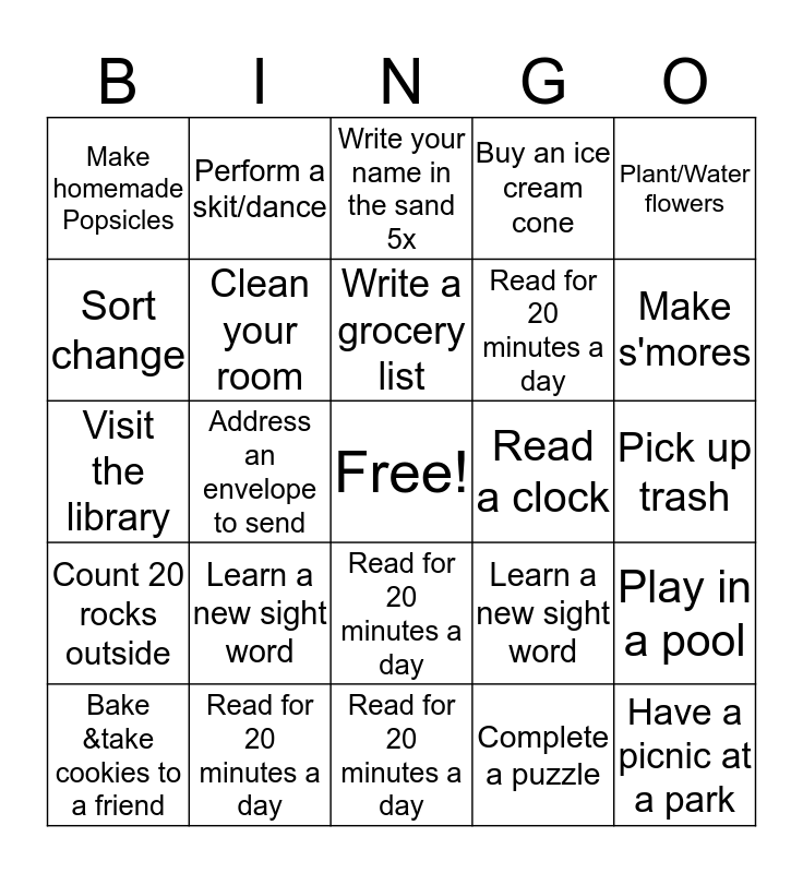 This bingo card has a free space and 24 words: Learn a new sight word, Read for 20 minutes a day, Write a grocery list, Bake &take cookies to a friend, Plant/Water flowers, Make homemade Popsicles, Sort change, Perform a skit/dance, Read a clock, Read for 20 minutes a day, Read for 20 minutes a day, Visit the library, Learn a new sight word, Play in a pool, Clean your room, Complete a puzzle, Pick up trash, Write your name in the sand 5x, Make s'mores, Address an envelope to send, Have a picnic at a park, Count 20 rocks outside, Buy an ice cream cone and Read for 20 minutes a day.