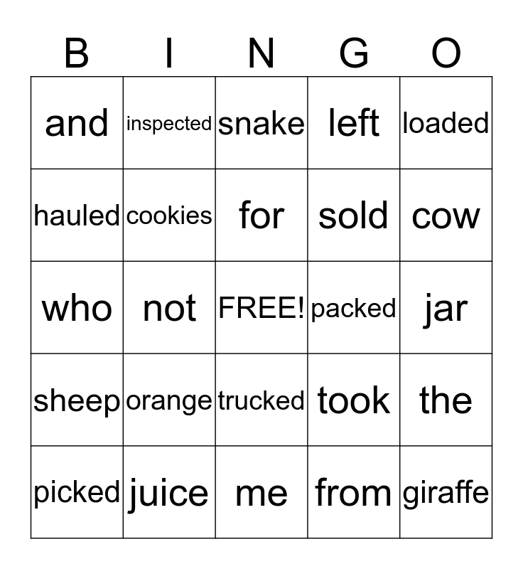 This bingo card has a free space and 24 words: orange, juice, for, picked, loaded, and, hauled, inspected, packed, trucked, sold, who, took, the, cookies, from, jar, snake, cow, not, giraffe, sheep, left and me.