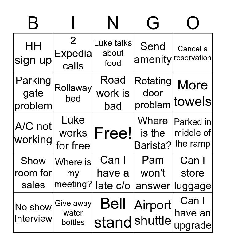 This bingo card has a free space and 24 words: Where is my meeting?, Give away water bottles, Road work is bad, No show Interview, Cancel a reservation, HH sign up, Parking gate problem, 2 Expedia calls, Where is the Barista?, Can I have a late c/o, Rotating door problem, A/C not working, Pam won't answer, Can I store luggage, Rollaway bed, Airport shuttle, Parked in middle of the ramp, Luke talks about food, More towels, Luke works for free, Can I have an upgrade, Show room for sales, Send amenity and Bell stand.